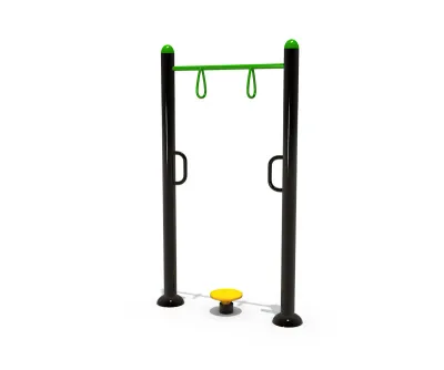 The vertical orientation and compact footprint of this unit make it ideal for space-constrained urban fitness trails. The combination of the yellow rotating disc and overhead bars provides a full-body workout station without requiring a large safety surfacing area.