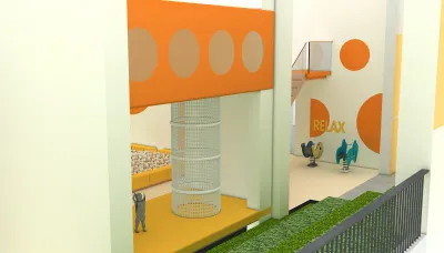 The compact, multi-level configuration and vibrant orange-and-yellow palette visible in this design make it an ideal centerpiece for climate-controlled retail environments or high-end shopping malls.