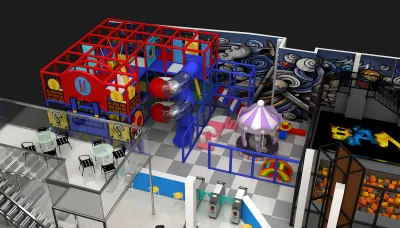 The inclusion of a dedicated cafe seating area and turnstile entry points visible in the rendering makes this layout perfect for revenue-generating indoor parks. The clear sightlines through the glass partitions allow parents to supervise children from the dining area while maintaining a secure, managed environment.