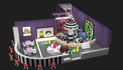 Featuring a sophisticated purple and monochrome palette paired with a dedicated dining area, this design is perfectly suited for upscale hospitality venues looking to provide a safe, aesthetically pleasing play space that complements a modern interior design.