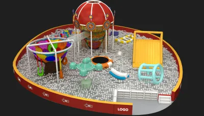 With its distinct hot air balloon aesthetic and vibrant primary color palette, this structure serves as a visual anchor for hotels or resorts looking to provide a premium, themed play experience that maximizes vertical space.