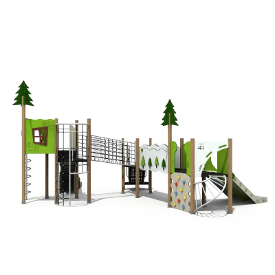 This nature-themed outdoor playground features a challenging rope bridge, climbing wall, and integrated slide for comprehensive physical development. Built with weather-resistant HDPE and reinforced steel, it ensures a safe and engaging environment for community play areas.