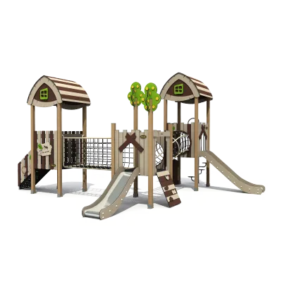 This nature-inspired outdoor playground features dual towers, slides, and a rope bridge designed to stimulate physical activity and imaginative play. Built with durable HDPE and galvanized steel, it ensures a safe and engaging environment for children in public parks or schoolyards.