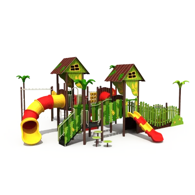 This vibrant jungle-themed outdoor playground features dual treehouse towers, a spiral tube slide, and interactive climbing elements. Designed for high-traffic commercial use, it utilizes durable HDPE panels and galvanized steel for maximum safety and longevity.