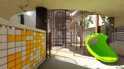 The compact footprint of the central caged tower and the spiraling slide geometry are specifically designed for space-constrained urban developments. The structure utilizes vertical height to provide a comprehensive play experience where horizontal square footage is at a premium.