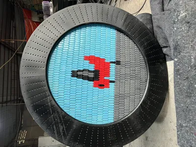 This heavy-duty ground trampoline features a unique modular tile mat with customizable pixel art designs. It is designed for high-traffic public spaces, offering a flush-to-ground safety profile and exceptional bounce durability.