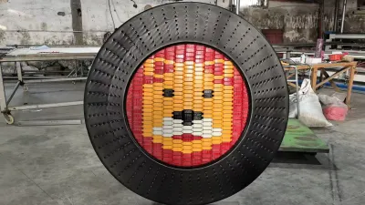 Central mosaic assembly utilizing UV-stabilized interlocking polymer blocks to maintain color saturation and impact resistance.