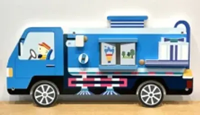 This truck-themed wall activity board features interactive elements like spinning wheels and sliding windows to engage young children's fine motor skills. Designed for space-saving indoor use, it is crafted from durable, non-toxic materials ensuring a safe and stimulating environment for toddlers.