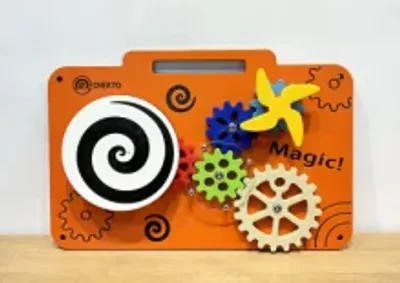 This wall-mounted sensory board features interlocking gears and a hypnotic spiral disk designed to stimulate fine motor skills and cognitive development. Crafted from durable, non-toxic HDPE, it provides a safe and engaging tactile experience for early childhood environments.