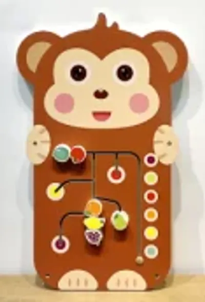 The friendly monkey aesthetic and warm wood-composite textures shown here are specifically designed to reduce anxiety in clinical or educational settings. Its wall-mounted configuration keeps floor space clear for mobility while providing a focused sensory station for toddlers.