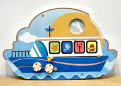 With its distinct boat-shaped profile and wave-patterned base, this panel integrates seamlessly into aquatic-themed indoor playgrounds. The durable HDPE construction visible ensures it can withstand the constant mechanical use of the sliding elements in high-traffic family entertainment centers.