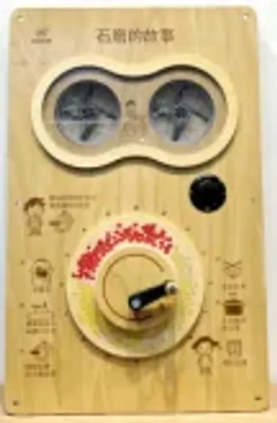 The natural wood grain finish and compact wall-mounted profile visible in this unit make it an excellent choice for indoor play corners or preschool classrooms where space-saving interactive elements are required.