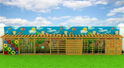 This versatile outdoor climbing wall combines physical challenges like tire climbing, rope nets, and rock walls to enhance children's motor skills. Designed for durability and safety, it serves as a comprehensive fitness station for schools and community parks.
