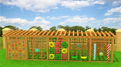 This versatile outdoor play structure combines climbing walls, tire obstacles, and swings into a compact wooden pergola design. It is engineered for physical development and social play, featuring weather-resistant materials and rounded safety edges for maximum security.