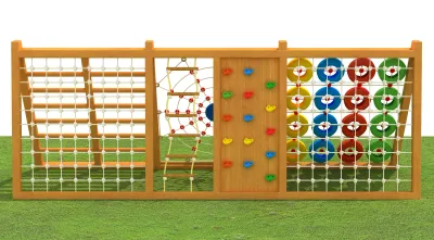 This versatile wooden climbing structure features a variety of physical challenges, including rope nets, a climbing wall, and a tire traverse. Designed for outdoor physical development, it utilizes high-quality timber and durable synthetic ropes to ensure a safe and engaging play experience.
