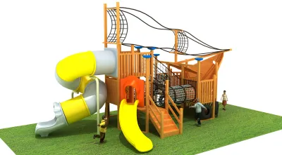 This ship-themed wooden playground structure is engineered for durability and imaginative play, utilizing premium treated timber and food-grade LLDPE for the slides. The design incorporates galvanized steel connectors and UV-stabilized rope nets to withstand harsh outdoor environments. Safety is paramount, with the unit meeting rigorous CE and TUV EN1176 standards, featuring rounded edges and secure handrails throughout. Maintenance involves a semi-annual inspection of the wooden joints for tightening and a seasonal application of wood sealant to prevent weathering. The plastic components can be easily cleaned with mild soap and water to maintain their vibrant yellow and white finish. This specific model is an ideal centerpiece for a Dubai residential park or a luxury resort play zone, offering a unique aesthetic that blends naturally with landscaped environments. The combination of a spiral tube slide, a wave slide, and intricate rope tunnels ensures high engagement for various age groups, promoting physical development and social interaction in a safe, controlled setting.
