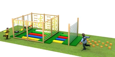 This versatile wooden adventure course combines climbing, swinging, and balancing elements to promote physical development in children. Built with high-quality treated timber and durable rope nets, it offers a safe and engaging environment for active outdoor play.